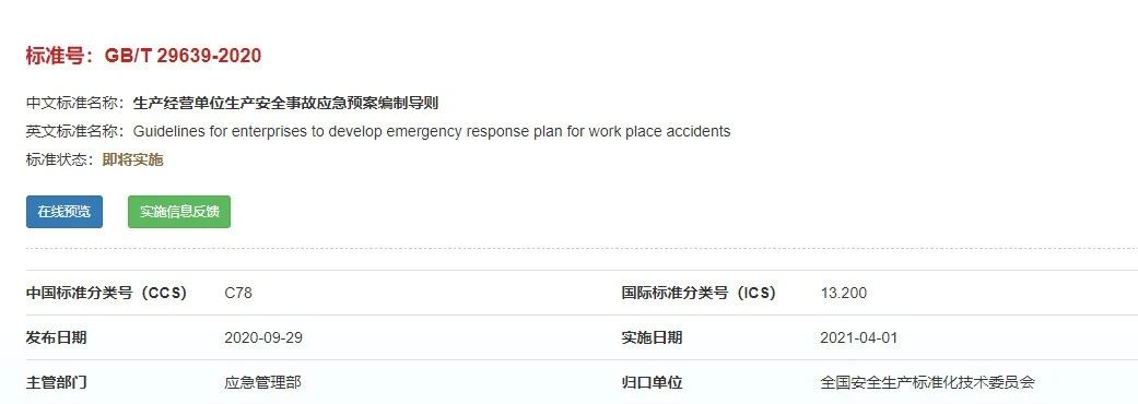 重磅!GBT29639-2020《生產(chǎn)經(jīng)營單位生產(chǎn)安全事故應(yīng)急預(yù)案編制導則》發(fā)布,21年4月實施!