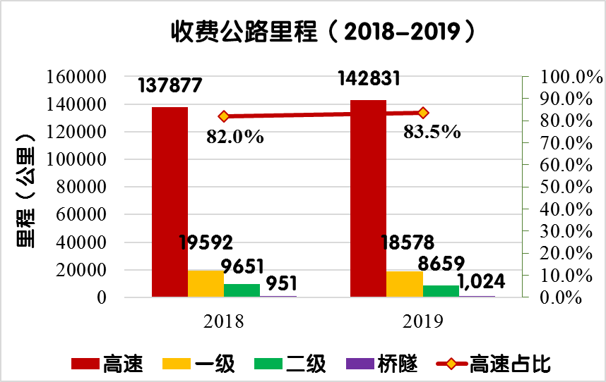 2019年末,全國收費(fèi)公路里程17.11萬公里,占公路總里程501.25萬公里的3.4%。其中,高速公路14.28萬公里,一級公路1.86萬公里,二級公路0.87萬公里,獨(dú)立橋梁及隧道1024公里,占比分別為83.5%、10.9%、5.1%和0.6%。