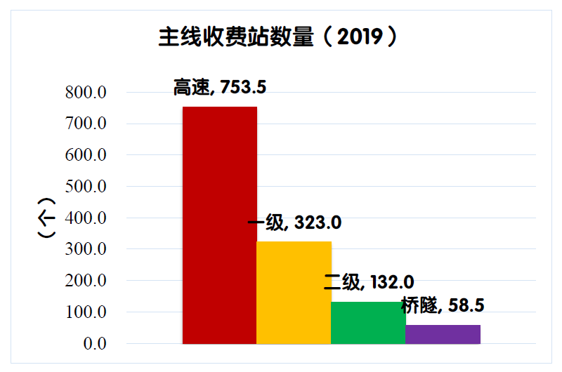 2019年末,全國收費(fèi)公路共有主線收費(fèi)站1267個(gè),比上年末凈減少49個(gè)。其中,高速公路753.5個(gè),一級公路323個(gè),二級公路132個(gè),獨(dú)立橋梁及隧道58.5個(gè),占比分別為59.5%、25.5%、10.4%和4.6%。