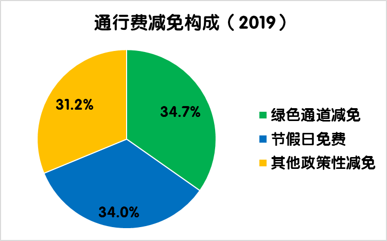 2019年度,全國收費(fèi)公路共減免車輛通行費(fèi)1009.7億元,占2019年度應(yīng)收通行費(fèi)總額的14.5%,比上年增加91.9億元,增長10%。其中,鮮活農(nóng)產(chǎn)品運(yùn)輸“綠色通道”減免350.8億元,占全年通行費(fèi)減免總金額的比例為34.7%,比上年增加5.8億元,增長1.7%;重大節(jié)假日免收小型客車通行費(fèi)343.7億元,占全年通行費(fèi)減免總金額的比例為34.0%,比上年增加35.7億元,增長11.6%;高速公路差異化收費(fèi)、ETC通行費(fèi)優(yōu)惠、搶險(xiǎn)救災(zāi)車輛免費(fèi)等其他政策性減免315.3億元,占全年通行費(fèi)減免總金額的比例為31.2%。比上年增加50.4億元,增長19%。