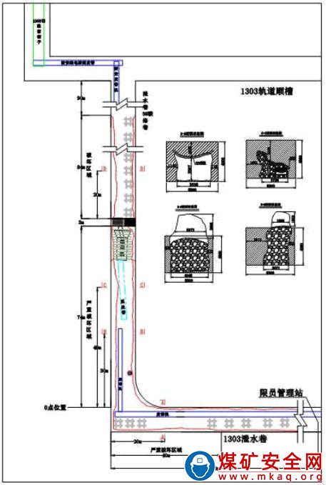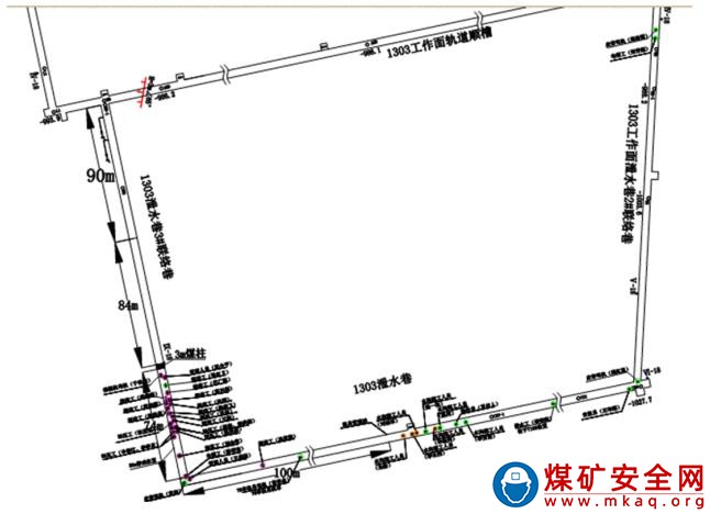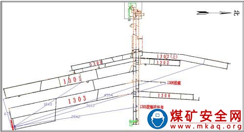 事故當(dāng)班,綜掘隊和防沖項目部在 1303 工作面泄水巷及 3 號聯(lián)絡(luò)巷施工。