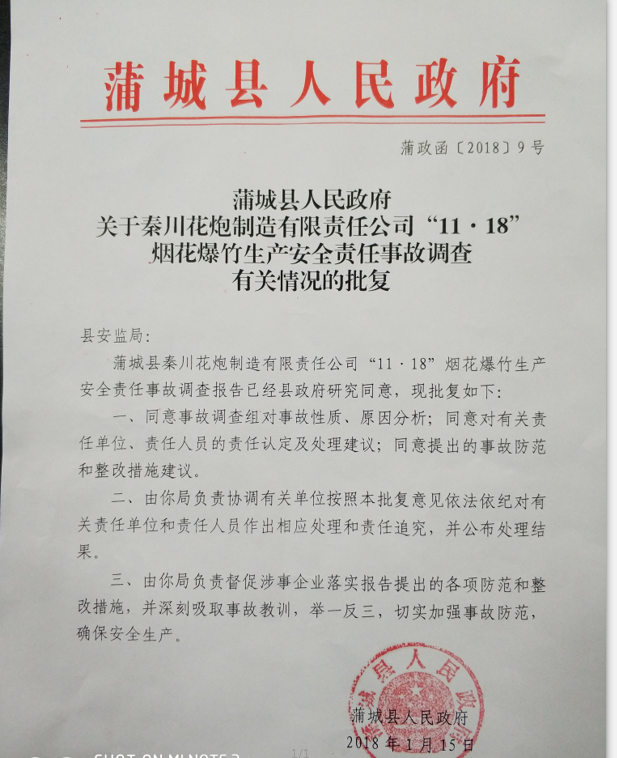 蒲城縣秦川花炮制造有限責(zé)任公司“11?18”煙花爆竹一般生產(chǎn)安全責(zé)任事故調(diào)查報告