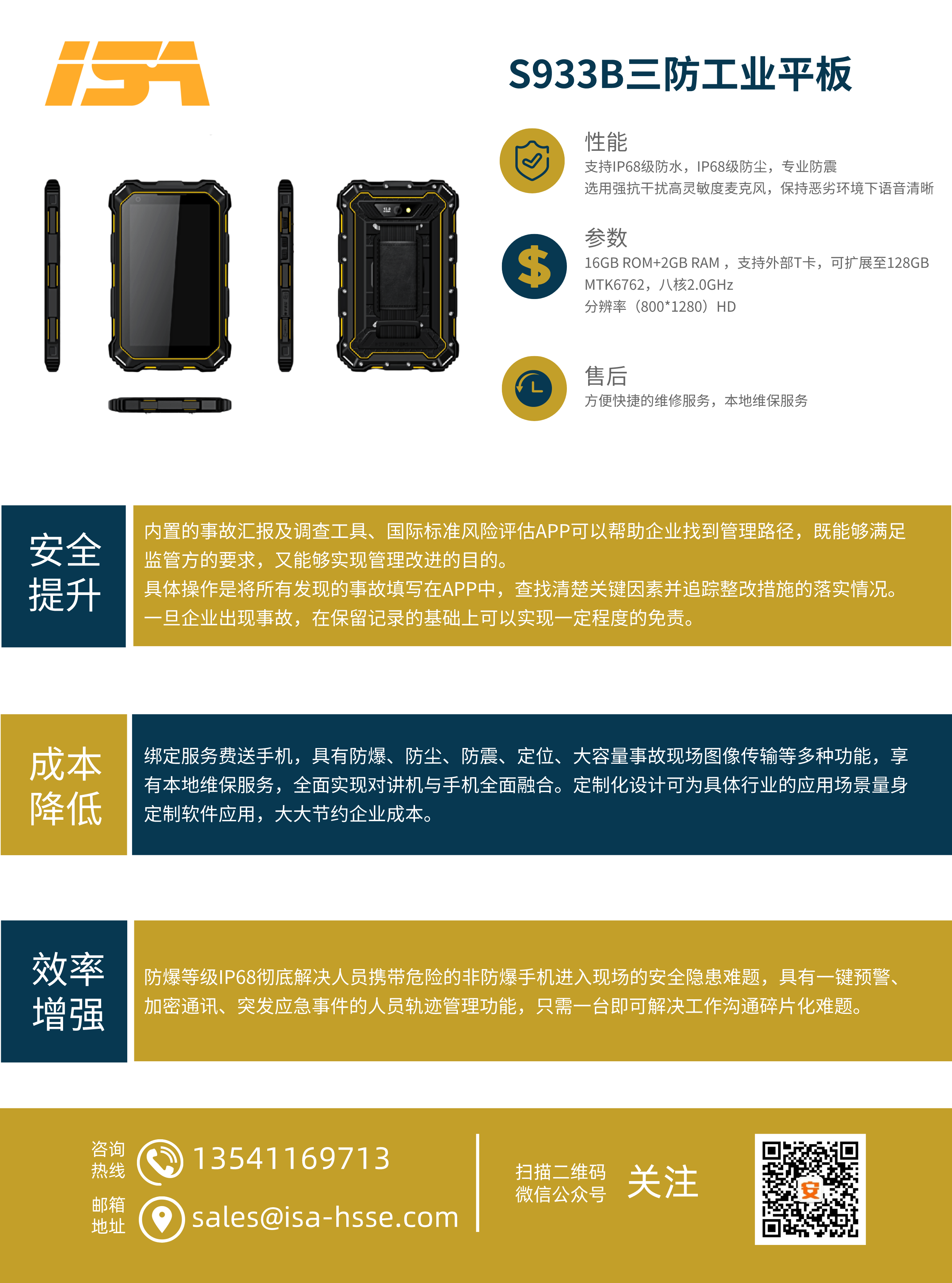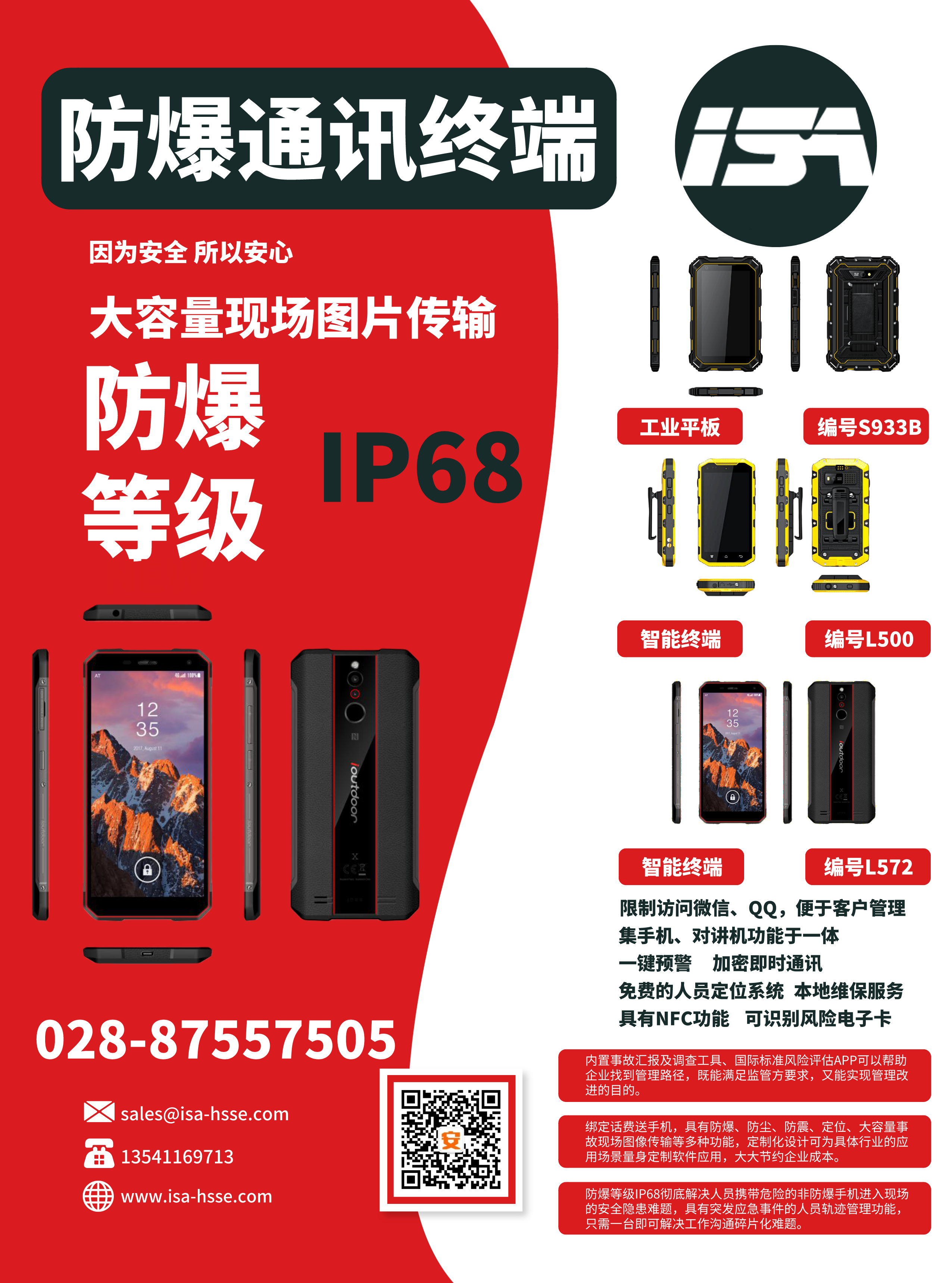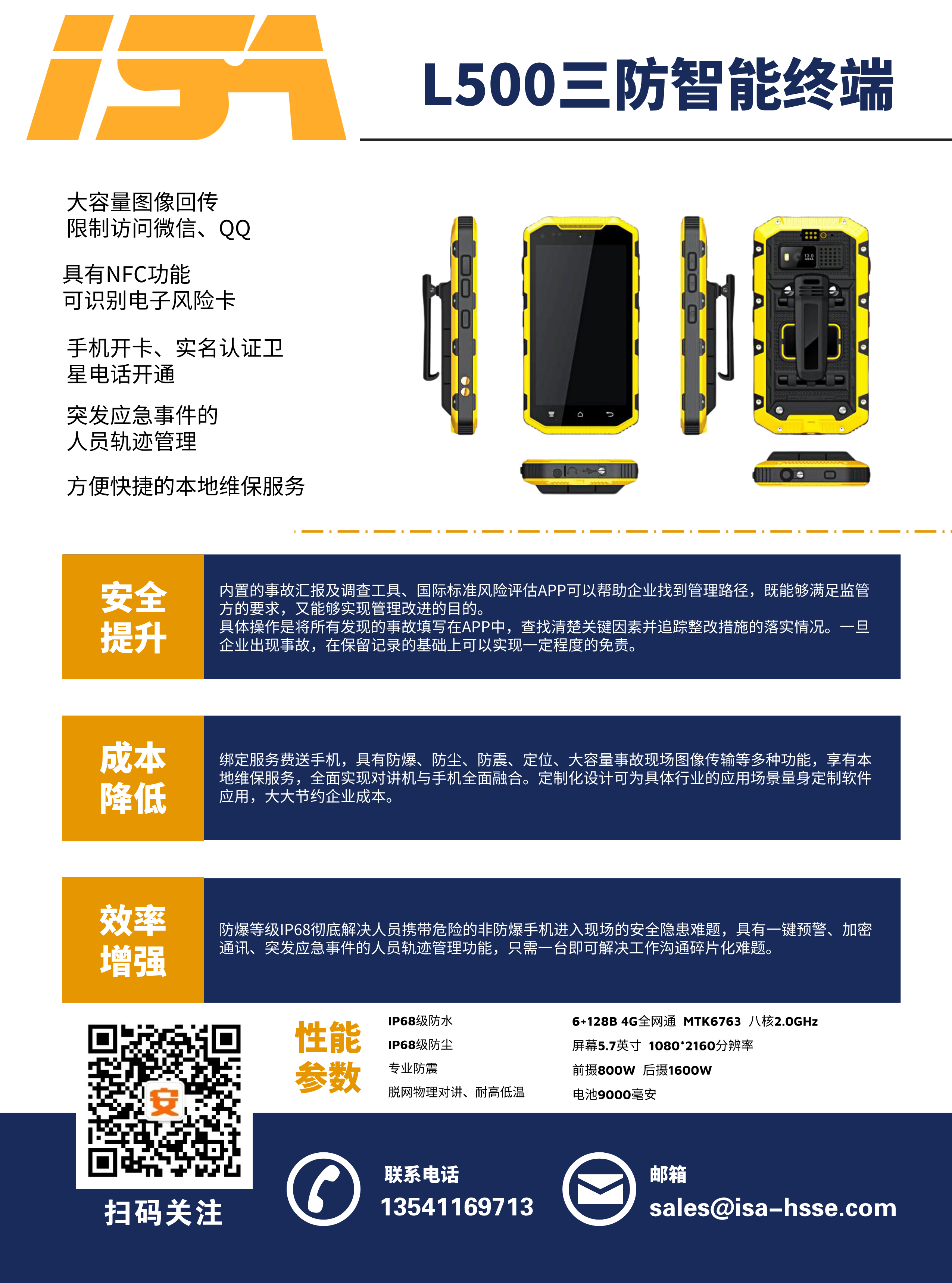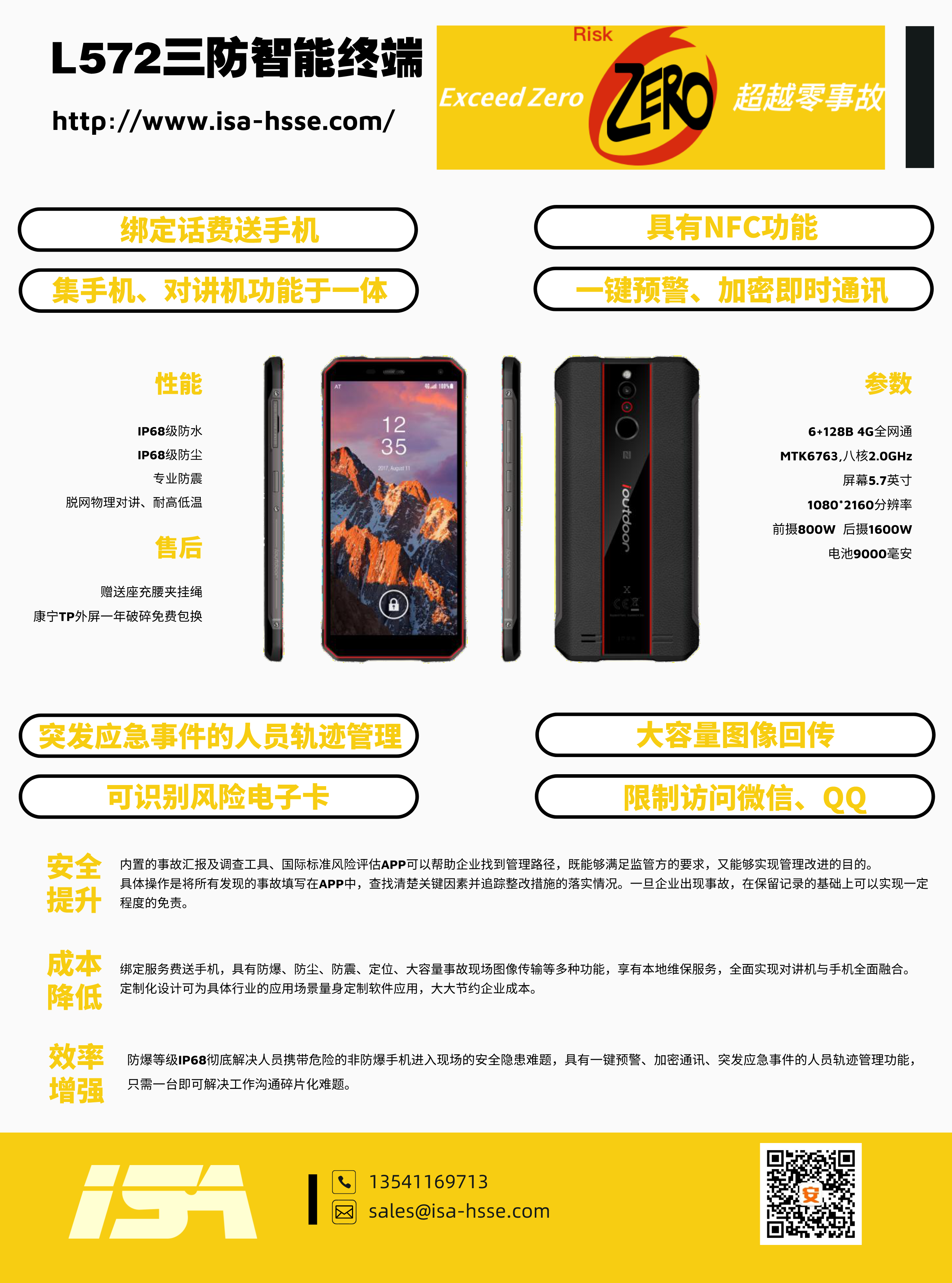 公司與運營商推出一款集手機、對講機于一體的防爆手持終端,包括各類商業(yè)安全軟件的使用、圖像回傳功能、一鍵報警、限制訪問微信QQ、NFC等功能。內含事故管理APP(隱患排查、風險評估),0元開卡,綁定即送話費流量,支持定制化服務。